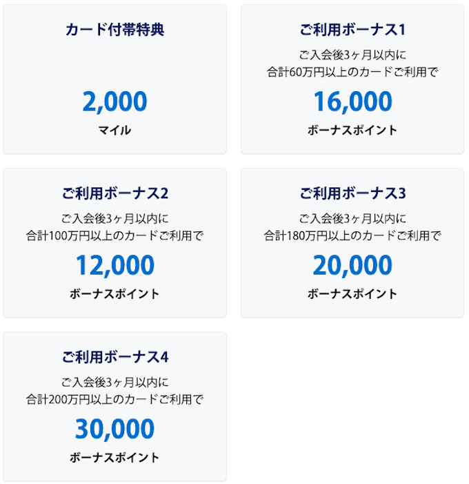 - 入会後3ヶ月以内に合計200万円以上の利用:30,000マイル