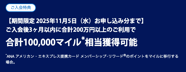 2025年10月現在、ANAアメックスゴールドは合計100,000マイルもらえるキャンペーンを開催中です。