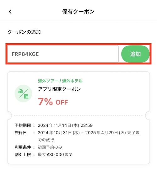- 「クーポンの追加」にある空欄にクーポンコードを入力