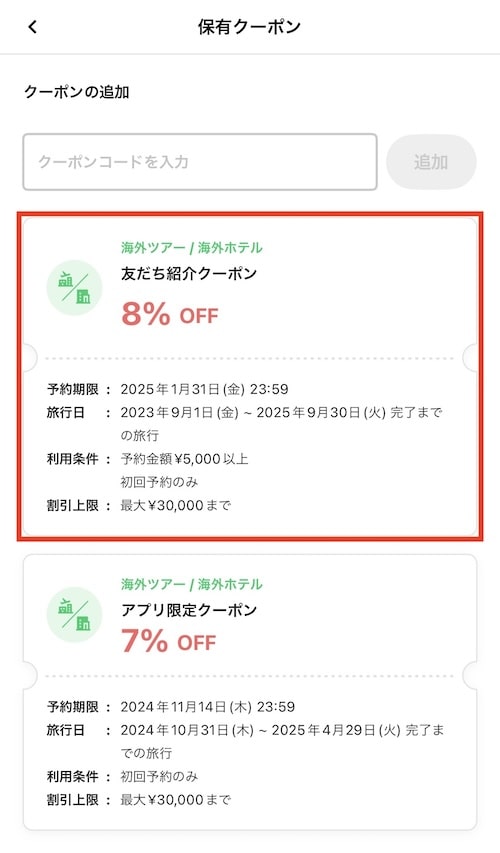 「マイページでのクーポン追加」または「予約時にクーポンコード入力」で8%OFFが適用になります!