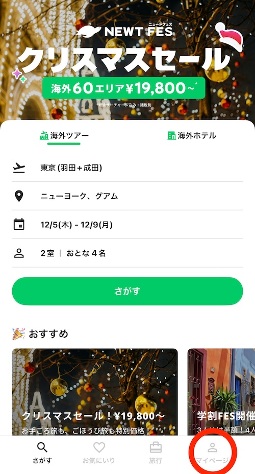 あとは「さがす」をタップすれば、予算やホテルグレードなどさまざまな条件のツアーが候補に上がってくるので、好きなものを選んで決済すれば、カンタンに予約できます!