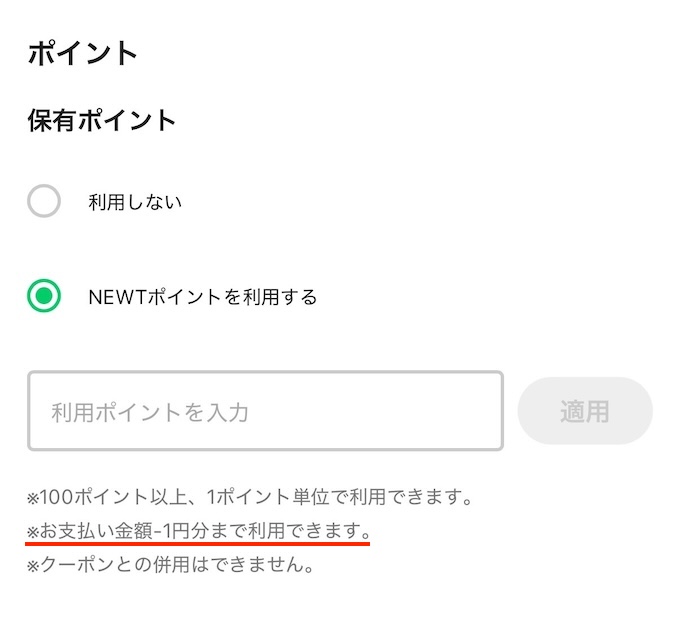 NEWTの旅行代金にはポイントで支払いが可能ですが、利用できるポイントは「お支払い金額 -1円分」までです。