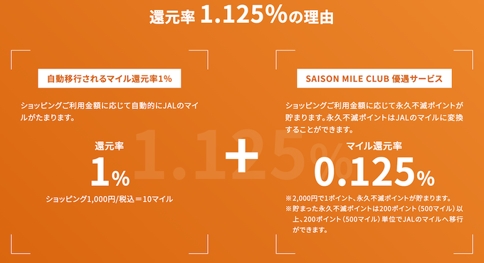 セゾンマイルクラブ | 還元率 | 1,000円利用で最大11.25マイル |